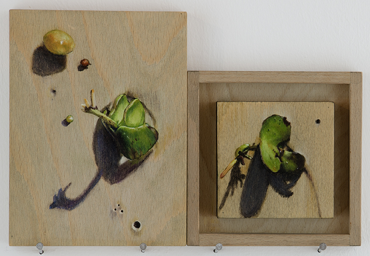 ‘signs of trouble (phyllospora and shell)’, 201, pastel pencil, powdered graphite and ink on two wood panels (20 x 20, 10 x 10cm) SOLD