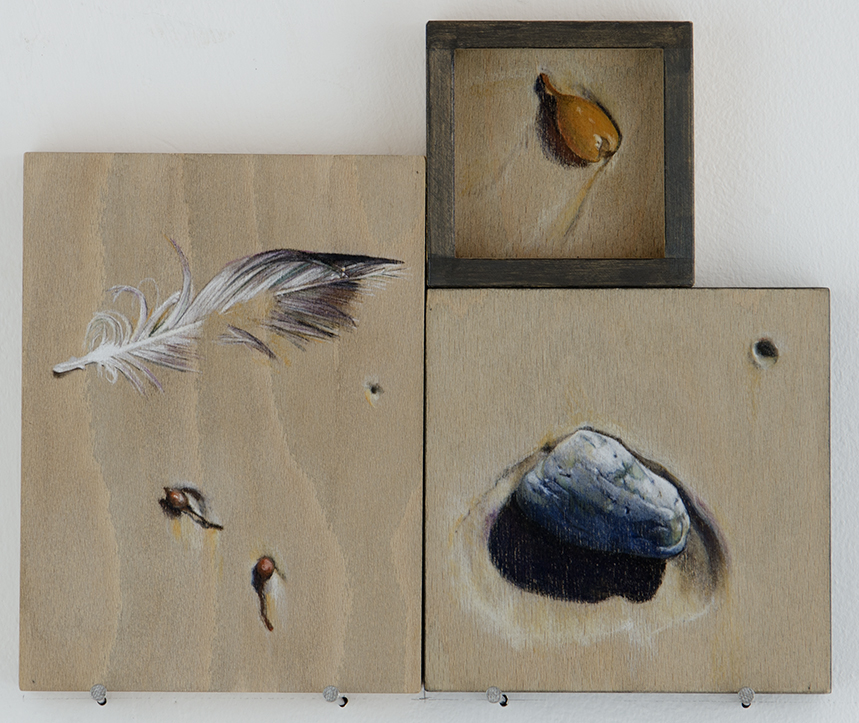 ‘signs of trouble (bird feather and pumice)’, 2015, pastel pencil, powdered graphite and ink on three wood panels (20 x 15, 15 x 15, 10 x 10 cm) SOLD
