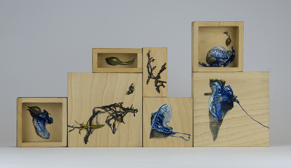 ‘beneath the pavement (beach side)’ 2016, pastel pencil, gesso, ink, powdered graphite on seven wooden boxes, sizes various SOLD