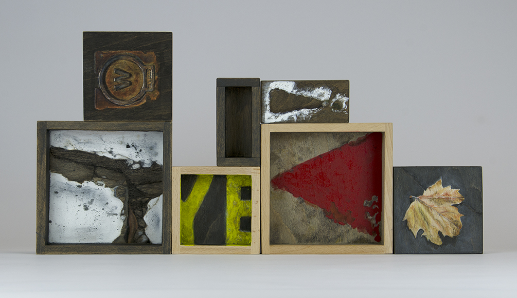 ‘beneath the pavement (street side)’ 2016, pastel pencil, gesso, ink, powdered graphite on seven wooden boxes, sizes various, SOLD