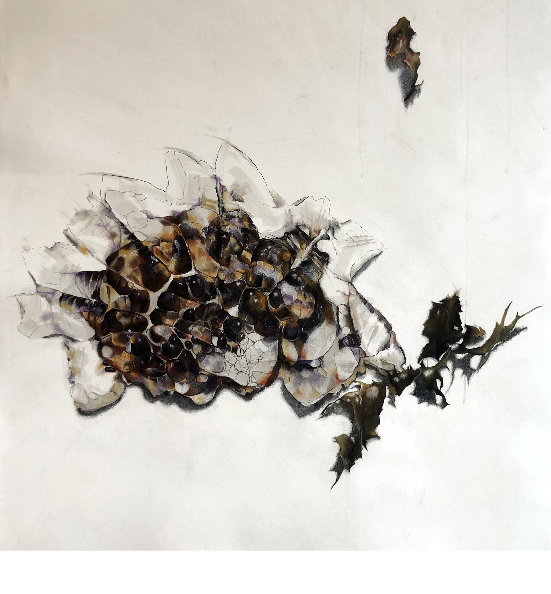 ‘rust and decay iv (tyre and leaves) 2025, pastel pencil and charcoal on BFK Rives, 56 x 56cm