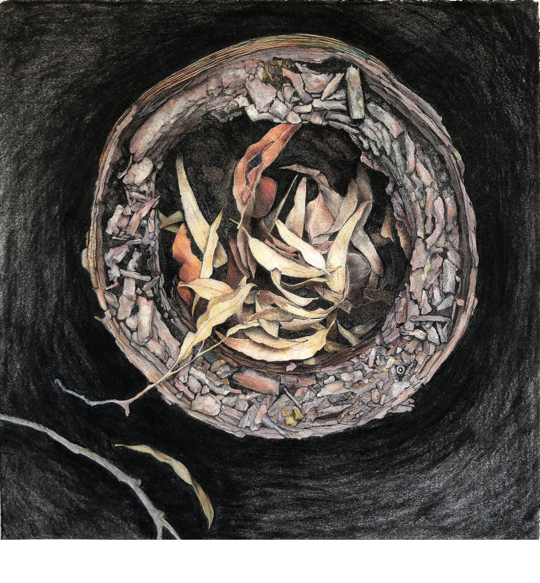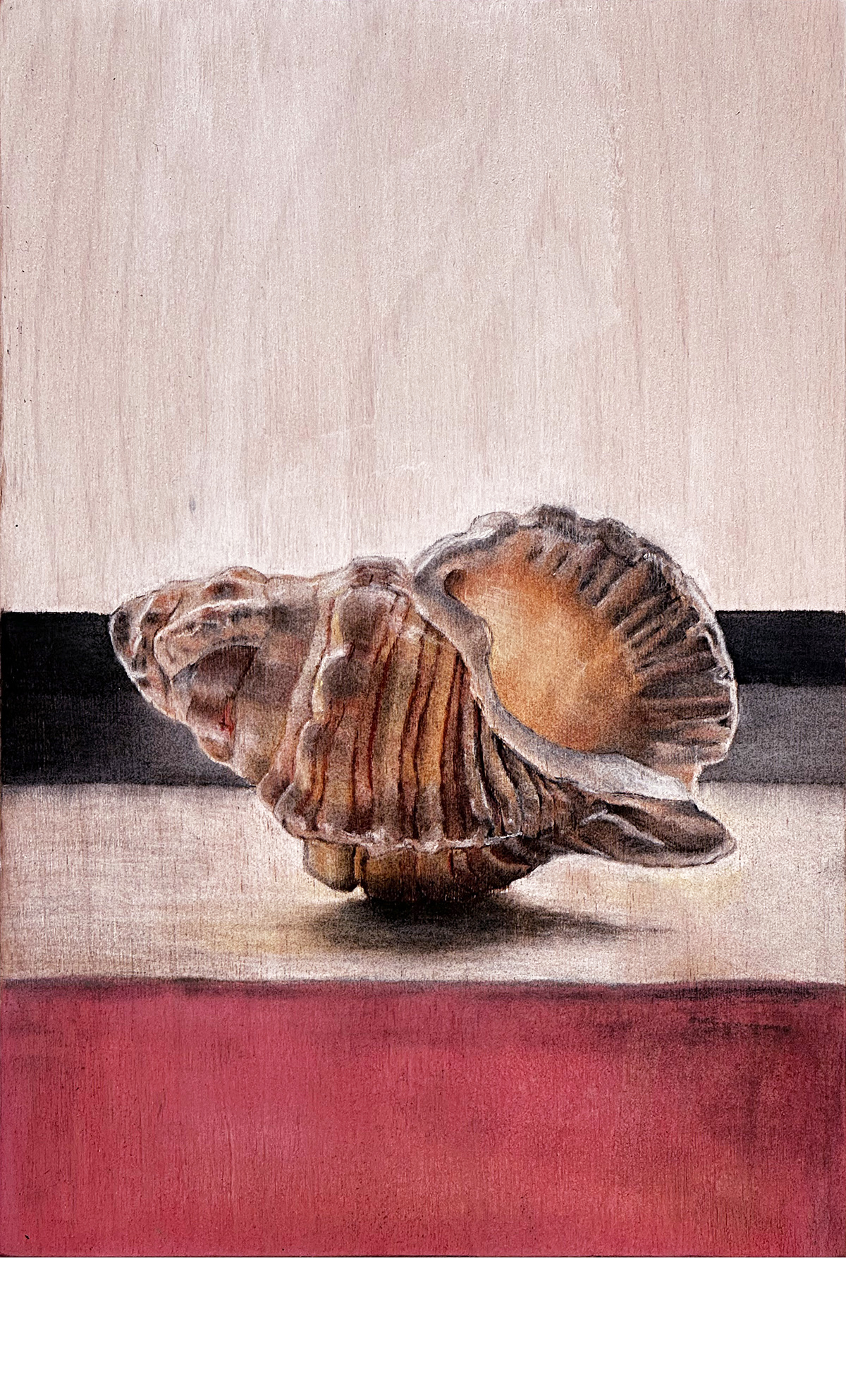 ‘Untitled (shell study)’ 2024, pastel pencil, graphite, acrylic paint and gesso on wood panel, 30 x 20cm SOLD