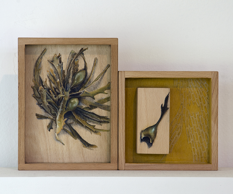 ‘signs of trouble (fish and phyllospora)’, 2015, pastel pencil and ink on two wood panels (20 x 15cm ea)
